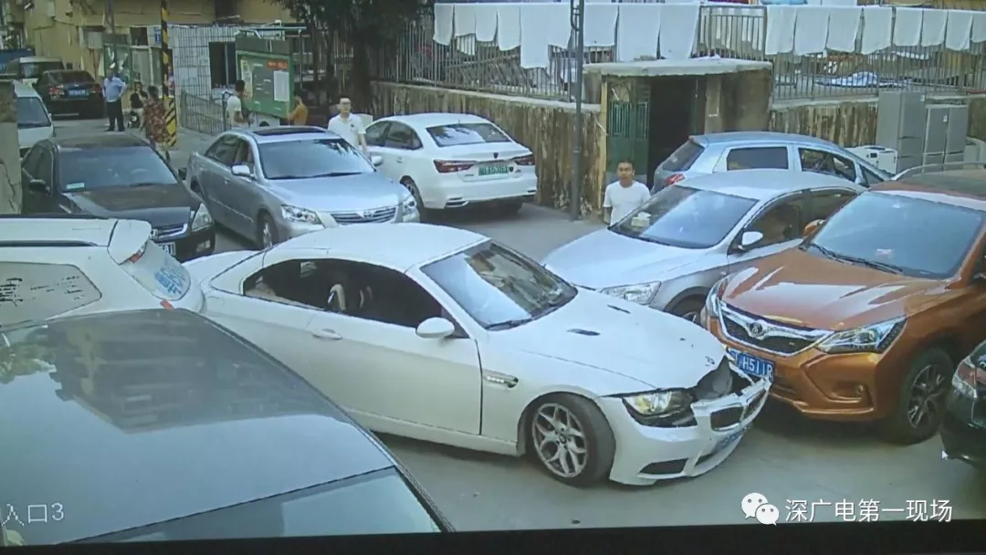 从监控画面中可以看到,粤E牌白色宝马小车,在原本就拥挤的停车路段内,不停地前进倒退,走着奇怪的路线,在倒车时他接连将停放路旁的车辆撞了个遍,随后便卡在了路中。