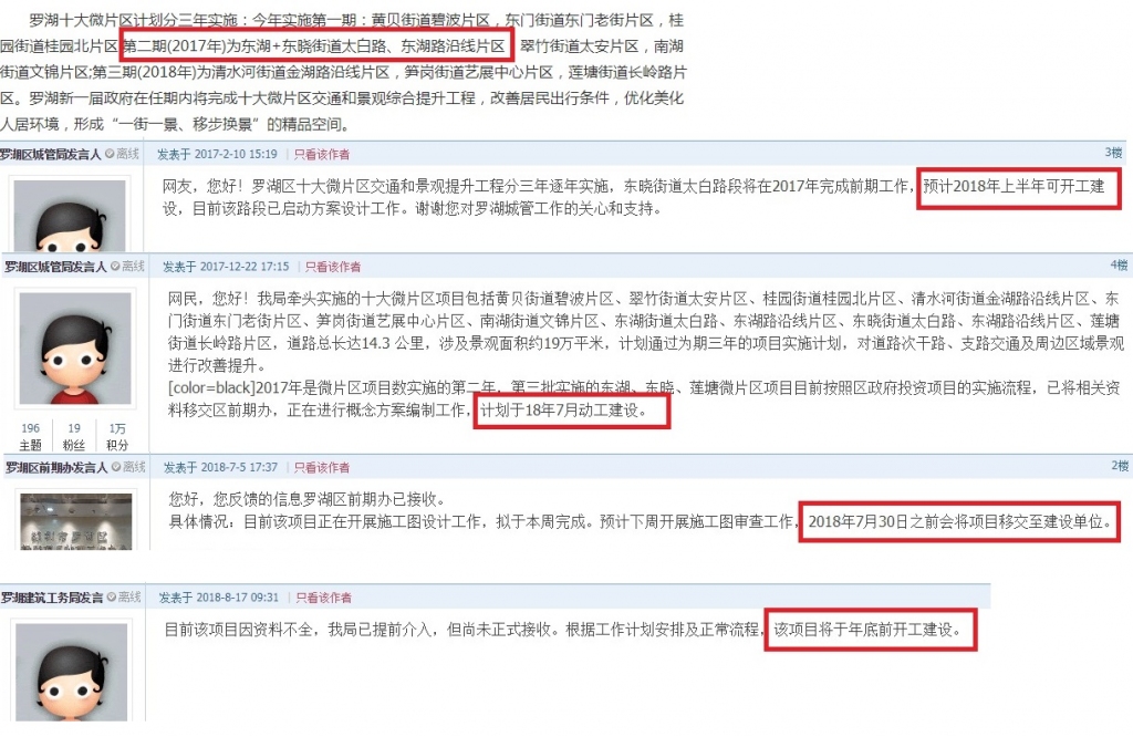 据了解,为改善居民出行条件,美化居住环境,罗湖区于2016年发布了十大微片区交通和景观综合提升工程计划。该计划表示全工程将分三年实施,而太白路-东湖路微片区属第二期,应于2017年开始动工实施。但截至2018年11月,该项目仍未动工。从网友发布的截图上看,一个名为“罗湖区城管局发言人”的论坛账号分别于2017年2月、12月以及2018年7月和8月对太白路-东湖路微片区景观提升工程延迟实施的计划进行了回复。而相应的动工日期也从2018年上半年延迟到了2018年底。