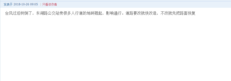 “再补一张,到2019年啦。”该网友在发帖后的几小时内,又补发了一张写有“2019年实施,2019年完工”的截图。并配图表示“台风过去快2个月了,东湖路的人行道石砖仍大片凸起,地铁站前面的道路凹凸不平,从来没有人来处理。”