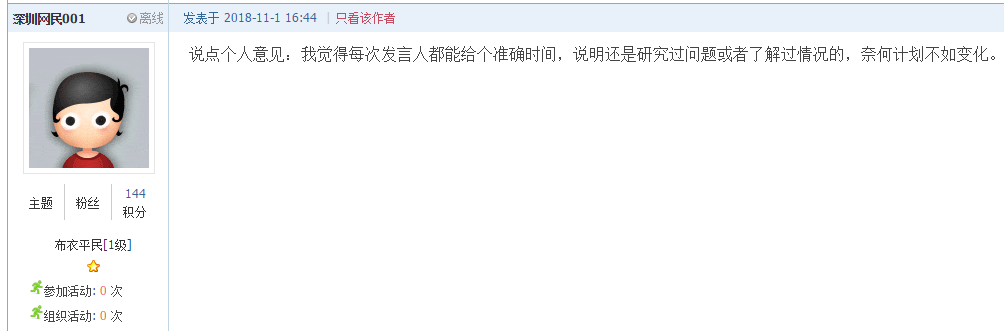 纵观该帖文,网友将2017年以来的文字截图一一呈现,“有图有真相”的质疑罗湖区相关政府部门。但,就如上图网友所言,不管面对何事,都应当让“理解”先行。只是当市民给予了一定理解之后,也希望相关部门信守承诺,尽量避免屡次爽约,毕竟政府部门的信用是靠其一言一 行来建立的。