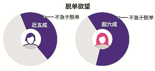调查显示,在脱单欲望方面,近五成单身男性和六成单身女性表示不急于改变单身状态。可见,单身男女的脱单欲望正在逐渐下降。