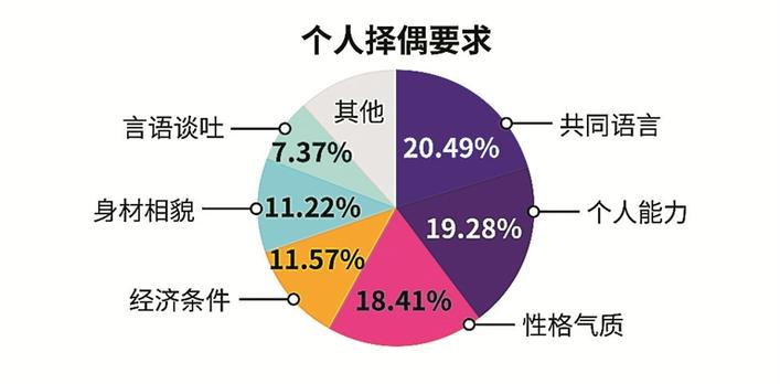 调查显示,共同语言、个人能力、性格气质为单身男女在择偶时最看重的三个方面,其次为经济条件、身材相貌、言语谈吐。可见,相较于过去条件上的匹配,更重视精神上的契合。