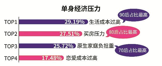 脱单难点中的经济压力层面分析发现,生活成本过高是影响脱单的最大单身压力,其次是买房压力,原生家庭负担重以及恋爱成本过高。