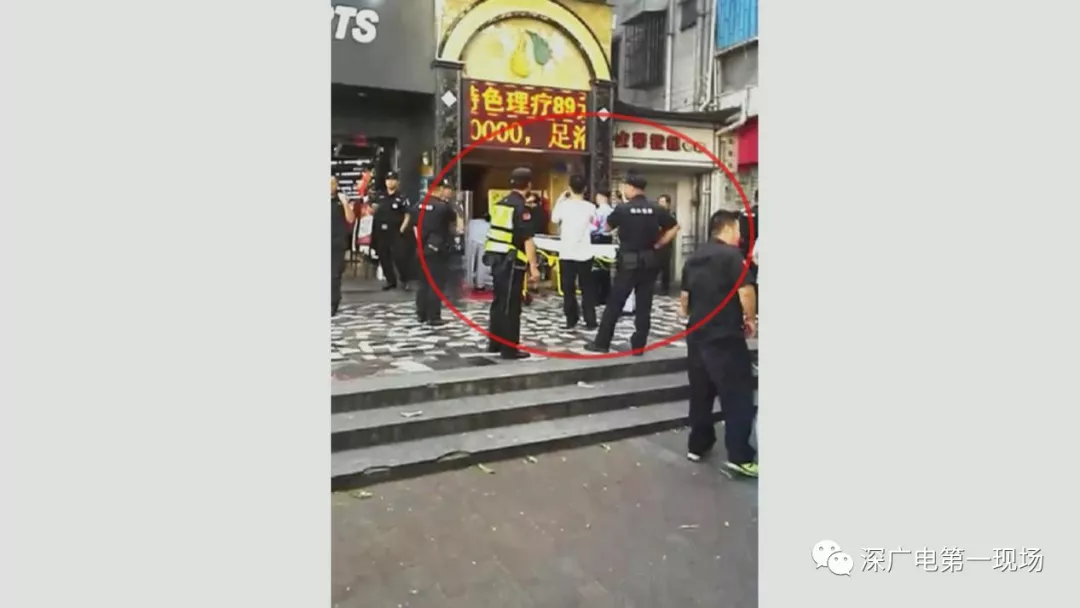 位于白石洲江南百货旁的事发地,一名年轻男子正躺在地上手捂着腹部,一旁还有两名女性同伴在照顾。