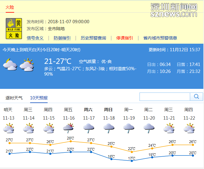 记者从深圳市气象局了解到,11日夜间到12日白天,深圳市多云间阴天;早晨最低气温22-23℃,东部及山地地区气温会低1-2℃;白天最高气温在28-30℃;相对湿度在45%-95%;偏北风2-3级,沿海和高地最大阵风4-5级;全市能见度普遍在5-15公里左右。火险预警信号生效中。