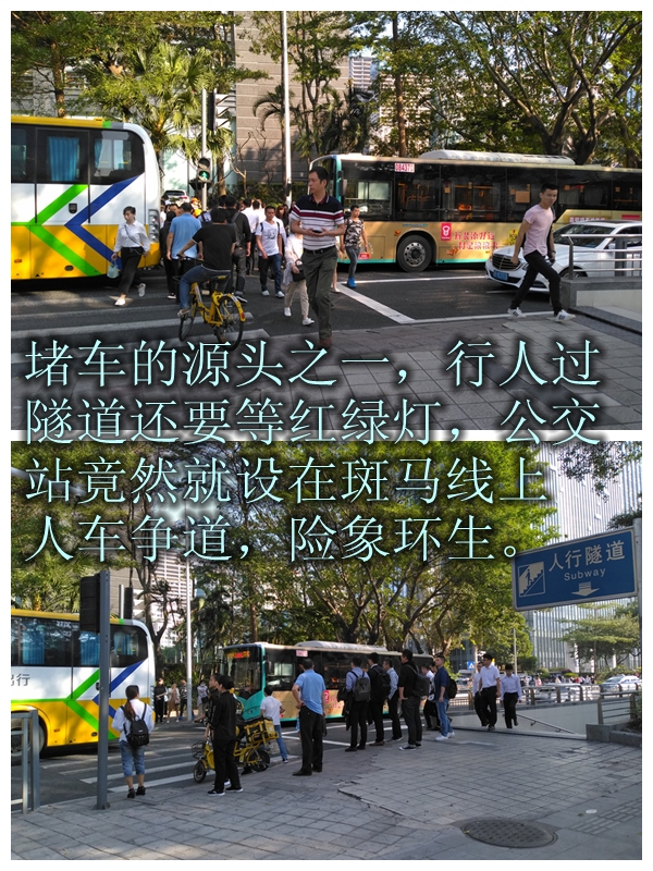 而在进入人行隧道前,又需要等红绿灯,且公交车站就设在这红绿灯前的斑马线上。“我不明白为何在交通这样混乱的地方,要设置公交车站,也不知为何‘为难’的都是市民。”网友“深圳大胡子”为这里每天通行的行人鸣不平,他希望能把招商银行公交站原来的港湾式站台恢复,方便市民乘车,也希望能尽快恢复正常的过街通道。