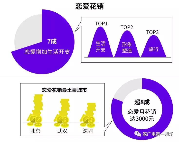 调查显示,71.65%的单身男女表示恋爱将会增加生活开支,开支增加的最主要方面为生活开支、形象塑造和旅行。