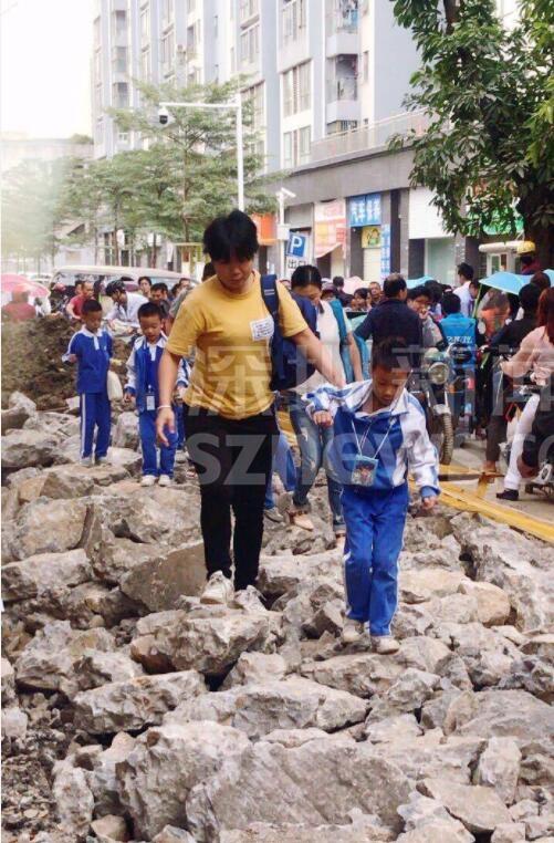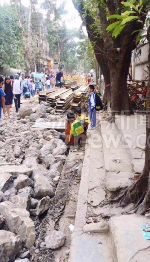 另有网友跟帖表示:同学们求学路坎坷,看得揪心!从现场图可以看到,学生上下学都要穿过工地。路面被挖开,道路边上只留下很窄的一条小道。上下学高峰期,成群结队的学生在碎石穿行,旁边小道上行人、三轮、电动单车堵成一锅粥,存在很大的安全隐患。