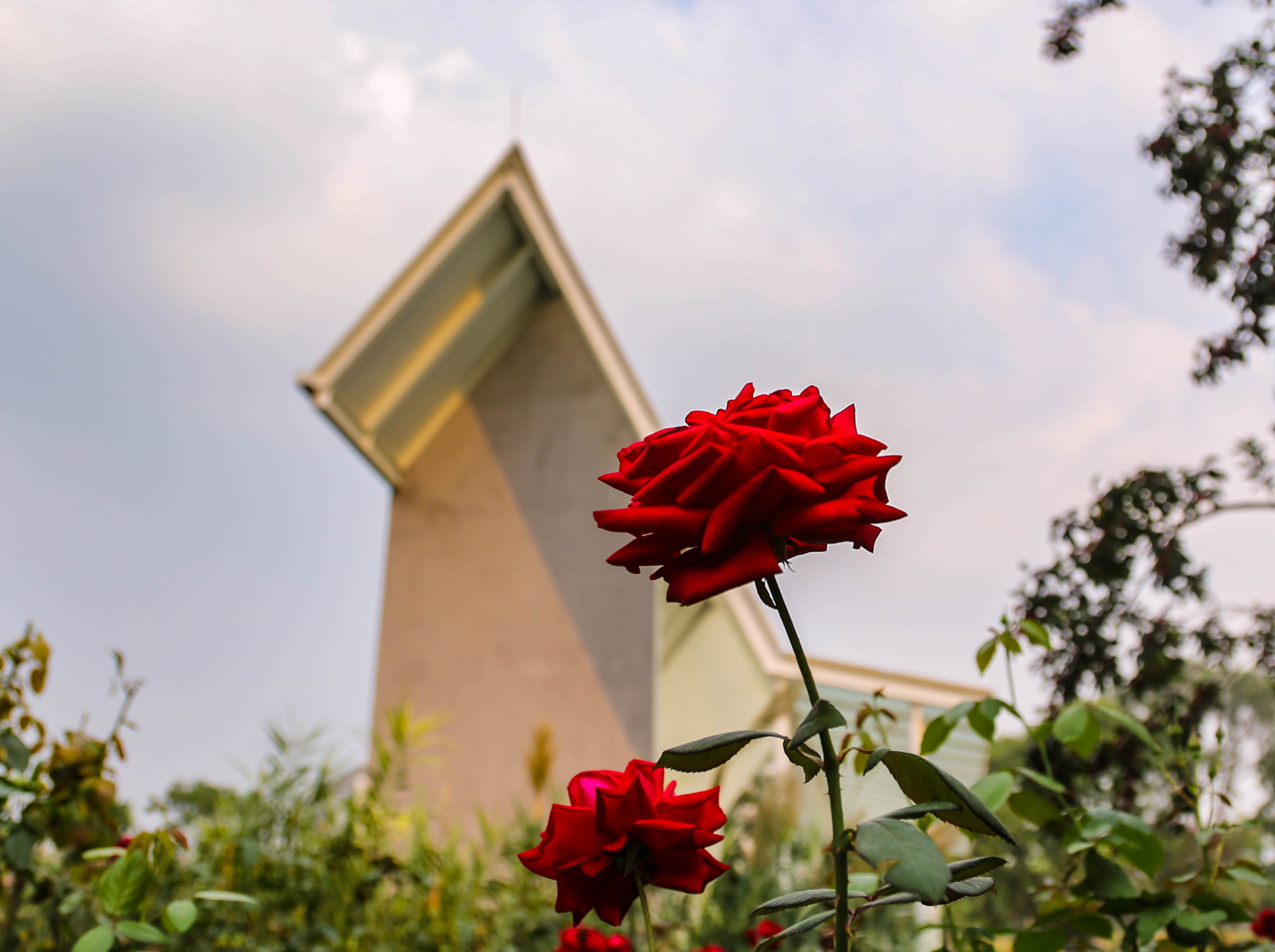 玫瑰花海的背景是两座礼堂,相隔不到十米。