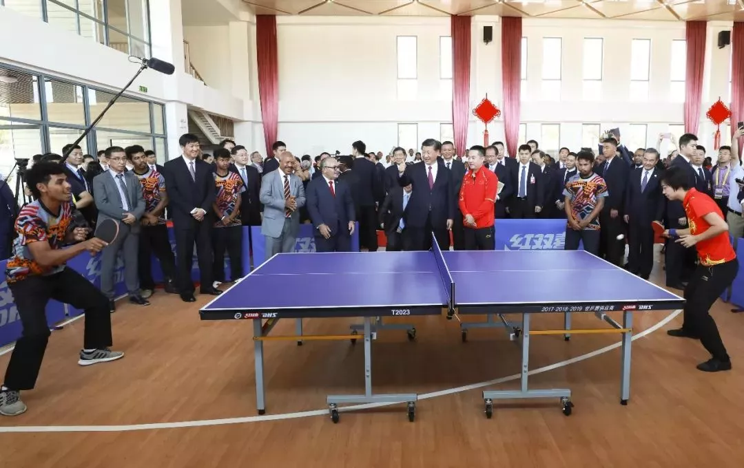 △在多功能厅内一角,中国乒乓球学院巴布亚新几内亚训练中心的中国教练员、奥运冠军张怡宁正在训练巴新运动员。习近平鼓励他们争创佳绩,做两国人民友好使者。(新华社记者拍摄)