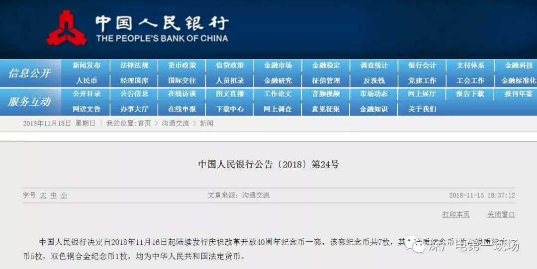 中国人民银行决定自2018年11月16日起陆续发行庆祝改革开放40周年纪念币一套。该套纪念币共7枚,其中金质纪念币1枚,银质纪念币5枚,双色铜合金纪念币1枚,均为中华人民共和国法定货币。面额分别分100元、50元、10元。