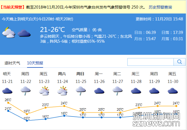 市气象局预计,20日17-20时,深圳市以多云天气为主;气温在22-25℃;相对湿度65%-85%;偏北风3-4级,阵风5-6级;全市能见度大部分地区在10公里以上。傍晚天气舒适,适合户外运动。21日夜间至22日冷空气影响,有小雨,北风加大,沿海和高地最大阵风7-8级,22日最低气温会降至15℃左右;23-24日晴天间多云,气温回升;25-26日,阴天有阵雨。