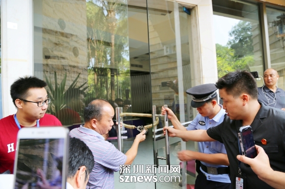 9月27日的清场腾退,法官和法警抵达泰某会所一楼,大门已锁,法院干警正尝试打开(福田法院提供)