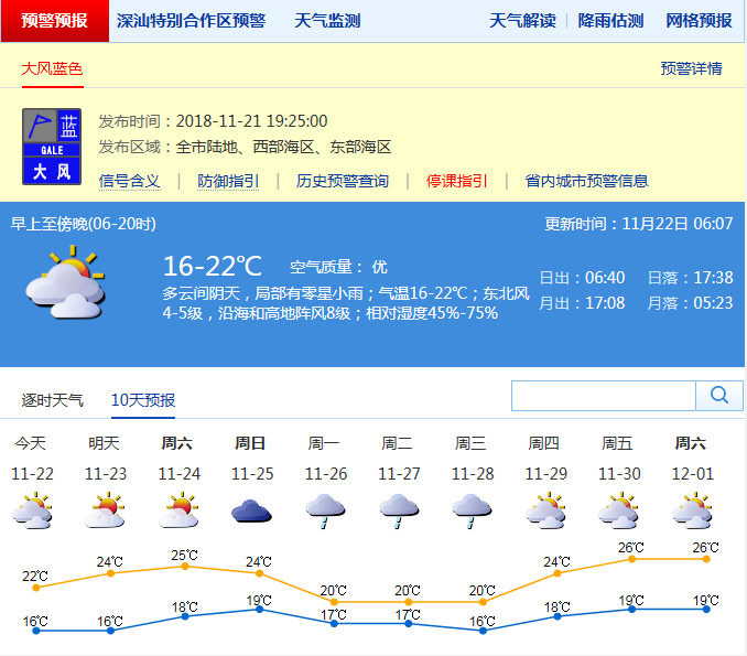 据气象测报,20日夜间到21日白天,深圳多云,局地有零星小雨,早晨最低气温21-23℃,白天最高气温27-29℃。但从21日夜间开始,深圳受冷空气影响,阴天有分散小雨,沿海和高地阵风7-8级,天气显著转凉;22日午后风力逐渐减弱,转多云;23-24日,以晴天到多云天气为主,可见阳光,早晚清凉;25日云量增多,偶有分散小雨;26-28日受冷空气补充影响,阴天有小雨。