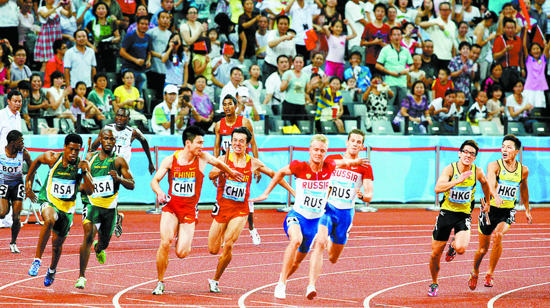 大运会中,深圳健儿男子4X100米接力赛上创佳绩。郑东升 摄