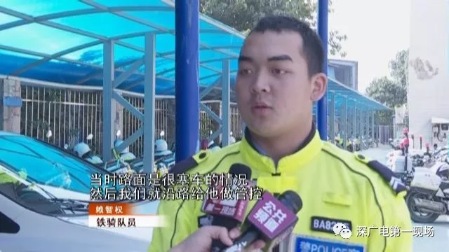 铁骑到场沿路管控,正在路面巡逻,松岗交警中队铁骑队员赖智权和他的两名同事,立即赶到现场。