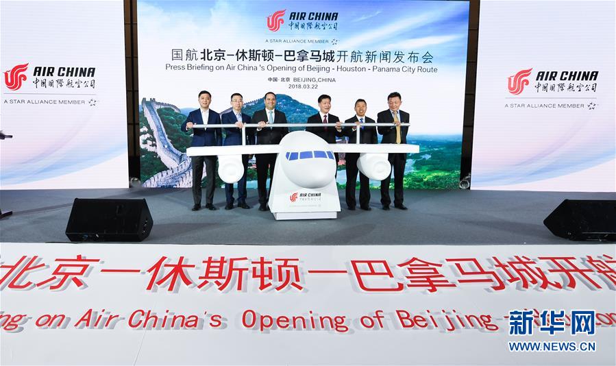 2018年3月22日,嘉宾在北京为北京—休斯顿—巴拿马城航线开通揭幕。中国国际航空公司于4月5日开通此条新航线。新华社记者李贺摄
