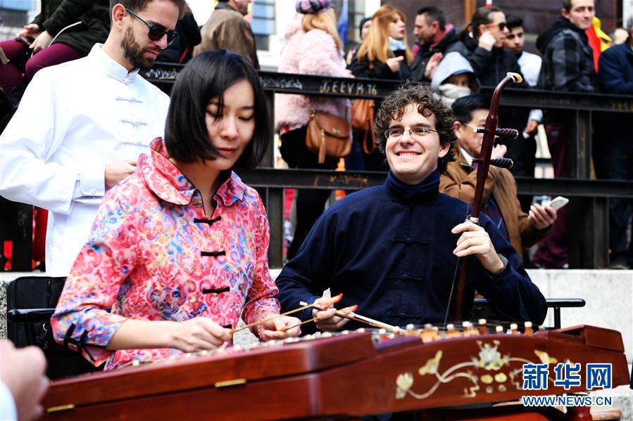 2018年2月11日,在西班牙马德里,参加弘扬中国传统文化的“快闪”艺术表演演员在索菲亚王后博物馆前演奏民乐。新华社记者郭求达摄