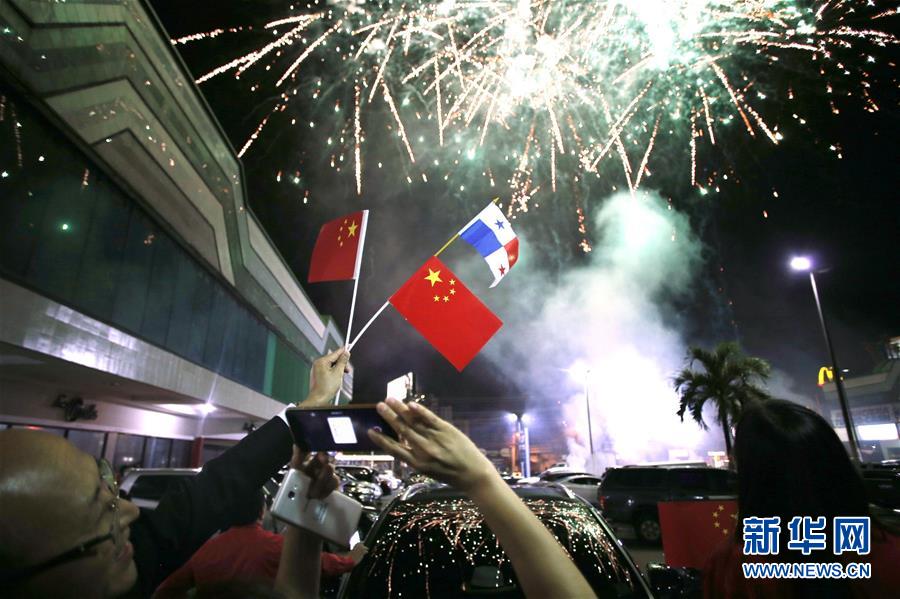 2017年6月12日,在巴拿马首都巴拿马城的华人社区,人们在巴拿马与中国建交的庆祝活动上拍摄烟花。新华社发(毛里西奥·巴伦苏埃拉摄)