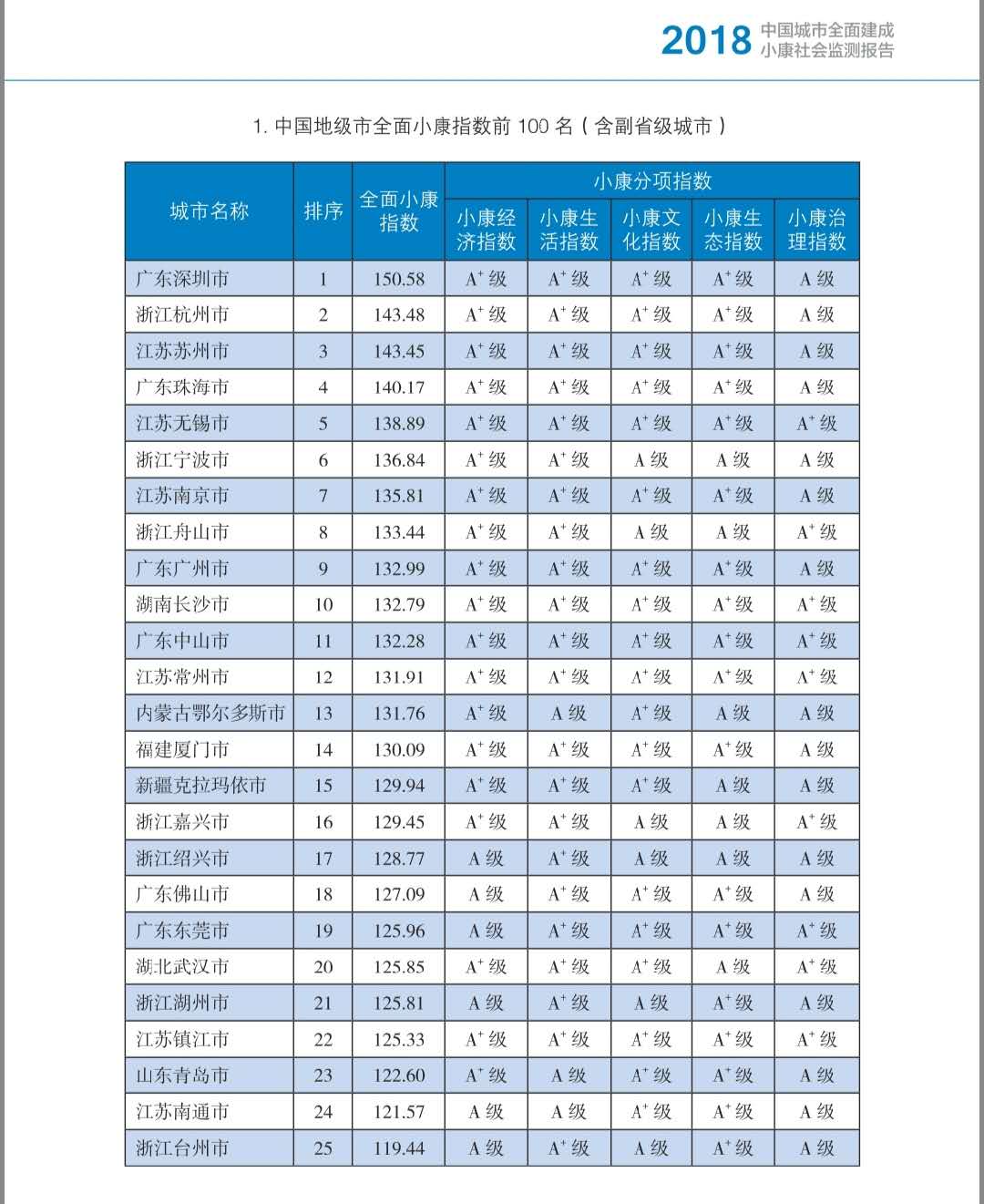 其中,深圳全面小康指数达150.58分,位列全国地级市(含副省级城市)全面小康指数前100名榜首。在分项指标中,深圳的小康经济指数、小康生活指数、小康文化指数、小康生态指数均达到A+级,小康治理指数为A级。