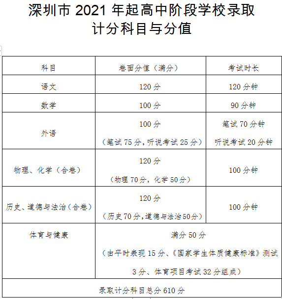 据悉,改革后中考满分为610分,计分科目为语文、数学、外语、体育与健康、道德与法治、历史、物理、化学。2021年中考正式采用新中考方案,考试实行全市统一命题、统一考试时间、统一评卷和统一公布成绩。
