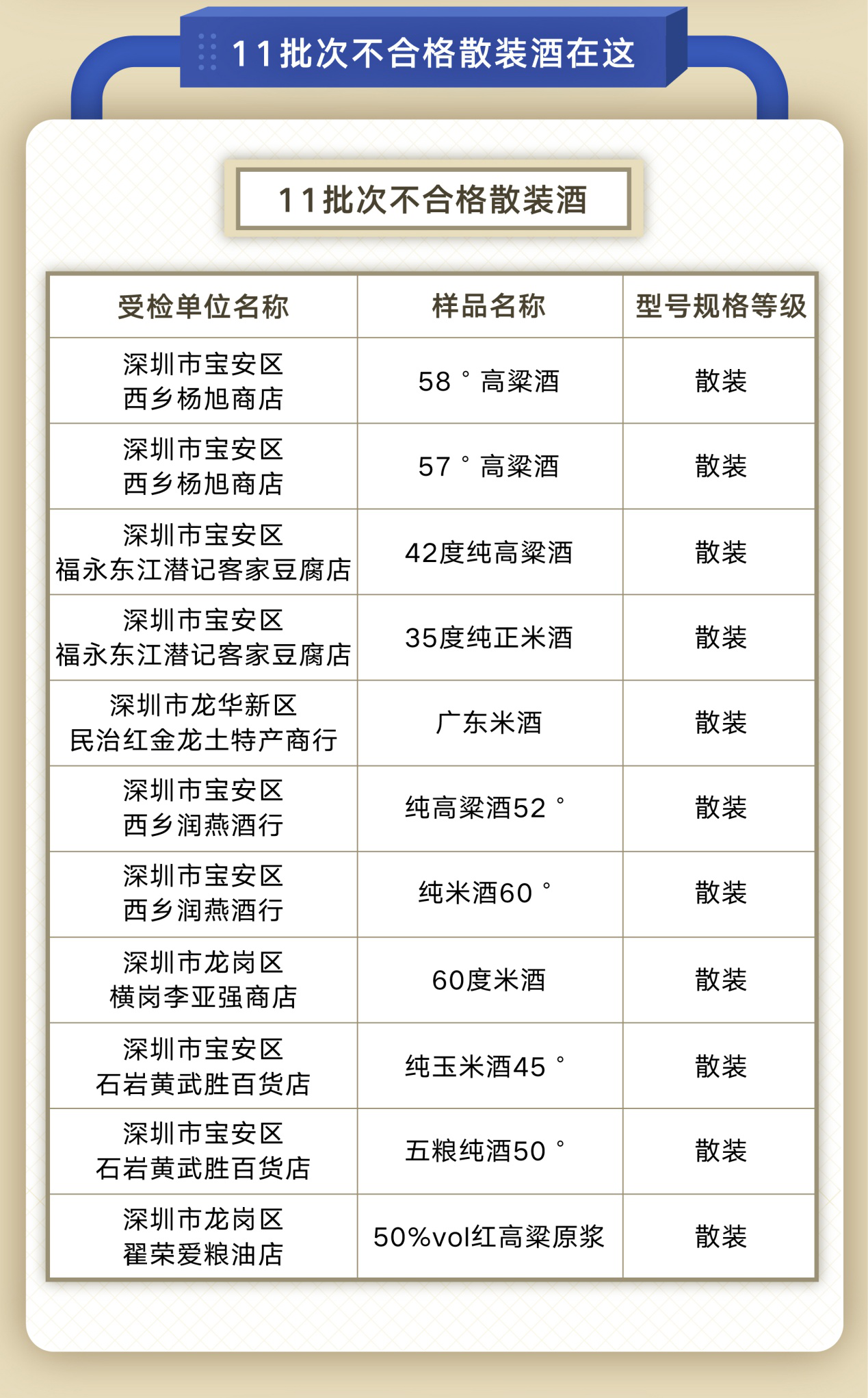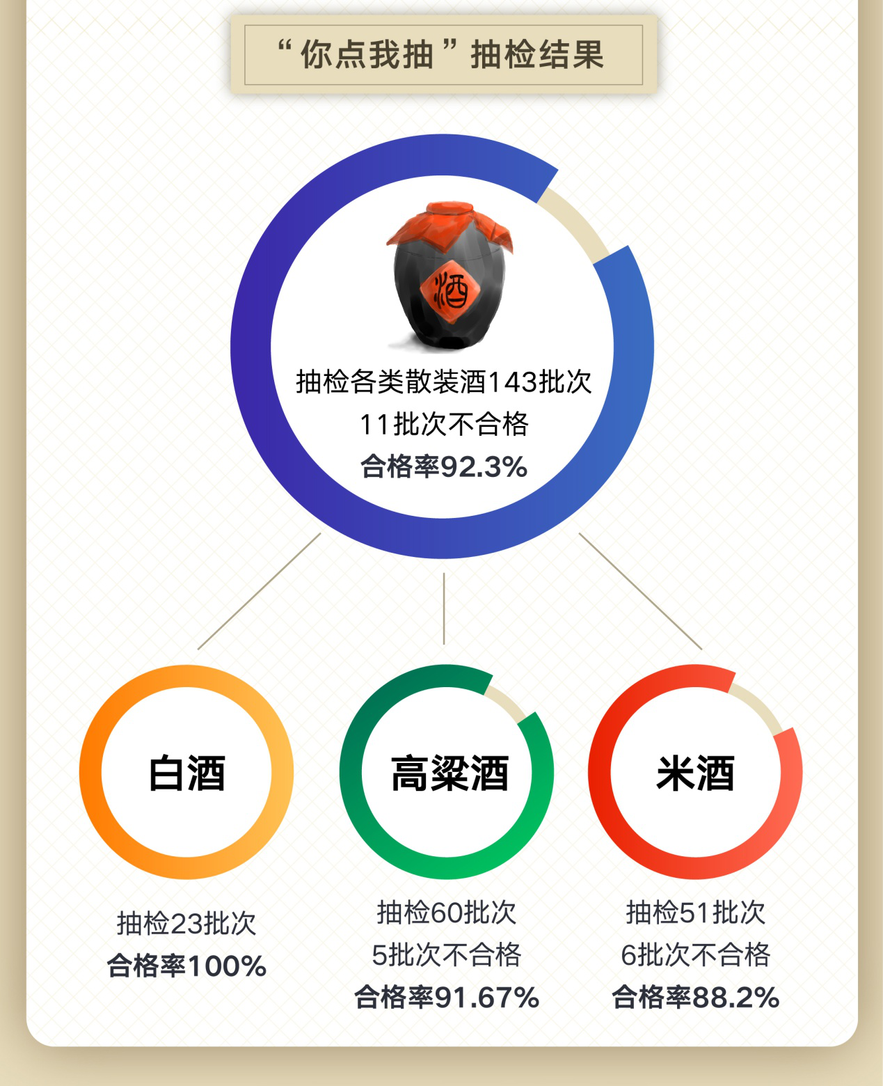 根据投票结果,此次共抽检各类散装酒143批次,11批次不合格,合格率92.3%。其中,抽检白酒23批次,合格率100%;抽检高粱酒60批次,5批次不合格,合格率91.67%;抽检米酒51批次,不合格6批次,合格率88.2%。