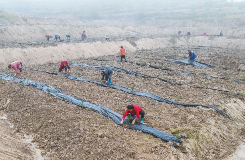 石笋镇鳌山村村民在地里栽植柑橘苗。