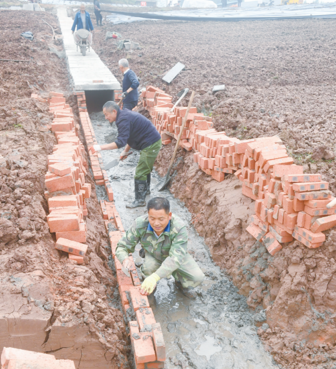 工人在石笋镇鲁江村蔬菜基地安砌沟渠。