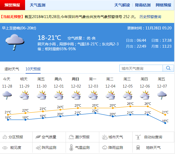 深圳市气象局预计,29日零星小雨转多云,可见阳光;30日到12月1日阴天间多云,偶有零星小雨;2到3日,多云,可见阳光。