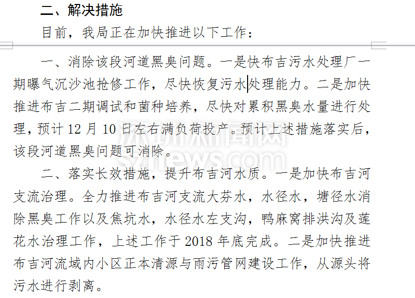 针对上述疑问,龙岗区环水局承诺将抓紧推进布吉污水处理厂一期曝气沉沙池抢修工作,尽快恢复污水处理能力,而二期工程也预计于12月10日左右满负荷投产,以上措施落实后,该环水局认为此段河道黑臭问题便可消除。为了保障治水工作长期有效,环水局还制定了加快布吉河支流治理及加快推进布吉河流域内小区正本清源与雨污管网建设工作的计划。
