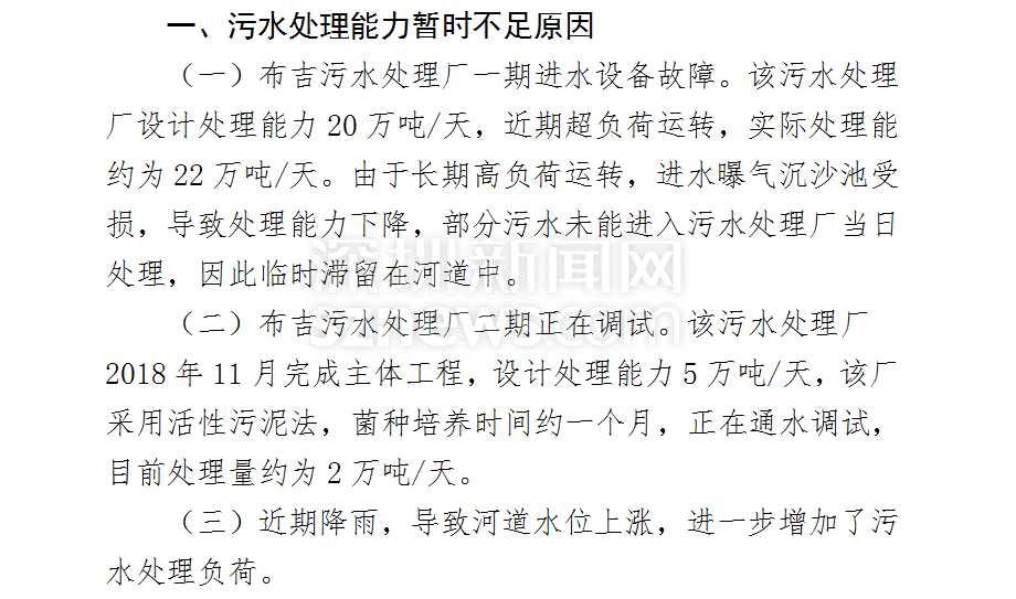 在其复函中,明确说明了河道黑臭的原因主要为该片区污水处理能力暂时不足(片区污水产生量约为26万吨/天,目前实际污水处理量约为24万吨/天),为防止生活污水直排下游,临时设置橡胶坝,生活污水临时滞留河道所致。