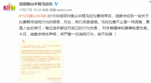 除了抄近道,比赛过程中还被曝出存在套牌、替跑等多种违规行为。例如,从网上流传的比赛参赛选手照片可以发现,同样是B22622的号码布,一位参赛选手的号码布是绿色的,另一位参赛选手的号码布则是蓝色的。除此之外,不少号码布都被曝出存在套牌行为。有市民表示,这样违背体育精神,也是自己骗自己,实在不可取。