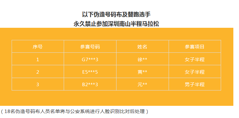 赛事组委会表示,赛后,他们也一直在整理、分析现场的照片、视频等素材。期间组委会也已收到部分新举报,包括抄近路、套牌及替跑等行为。经查证,在2018深圳南山半程马拉松比赛中,根据计时芯片数据、赛会录像、现场照片等材料证明,总计违规选手人数258人,其中伪造号码布18人,替跑3人,其他违规行为选手人数237人(其中穿越绿化带人数46人)。经组委会研究决定,按照《2018深圳南山半程马拉松竞赛规程》第7-8条规定,对258名违规选手作出如下处理,并根据要求将违规名单及处理结果上报至中国田径协会:
