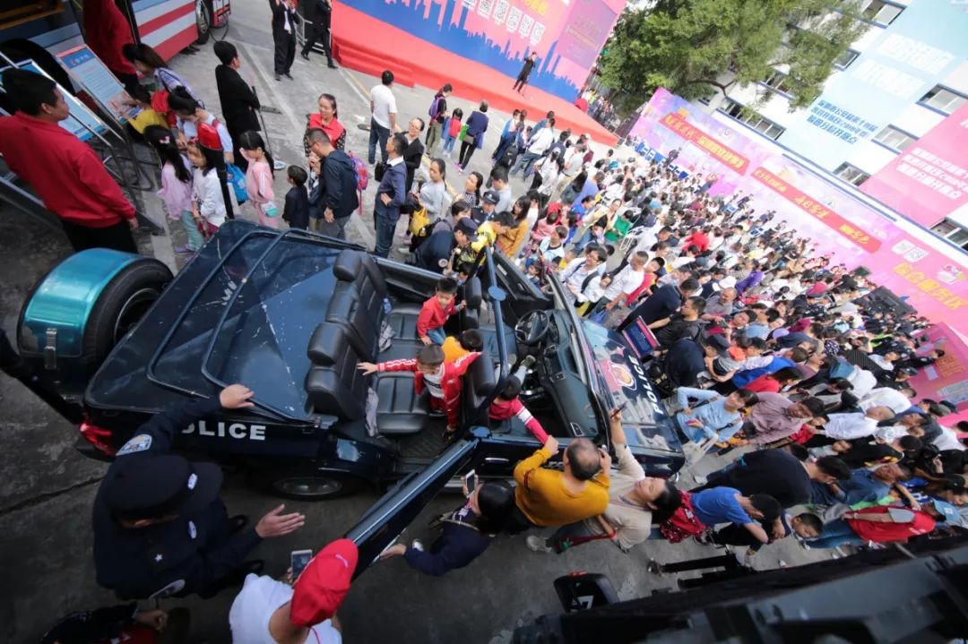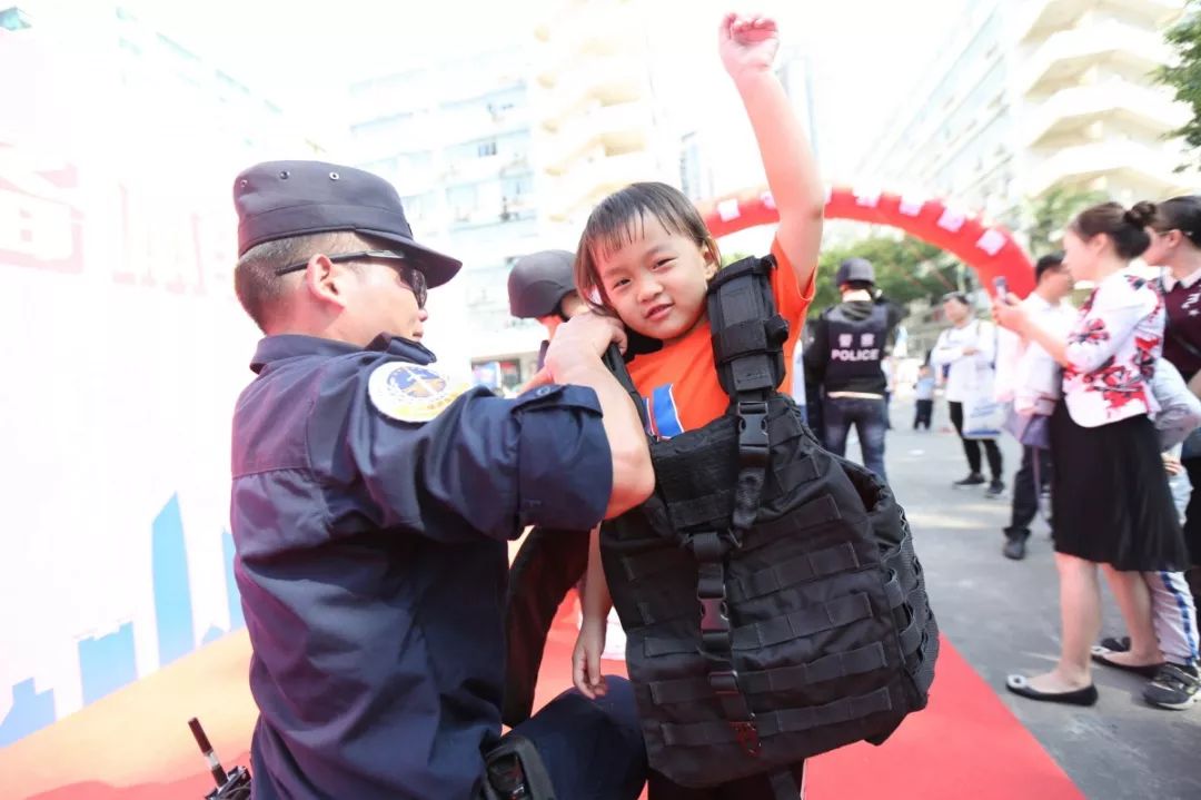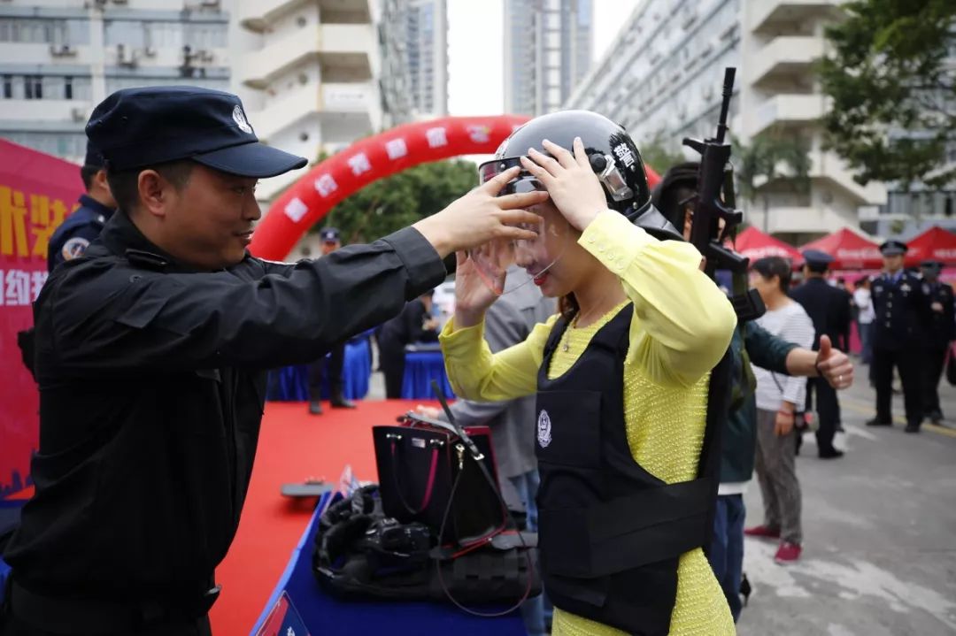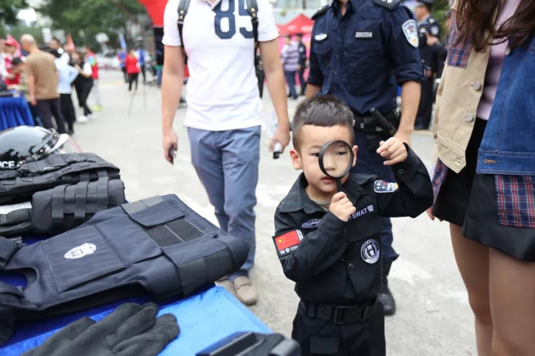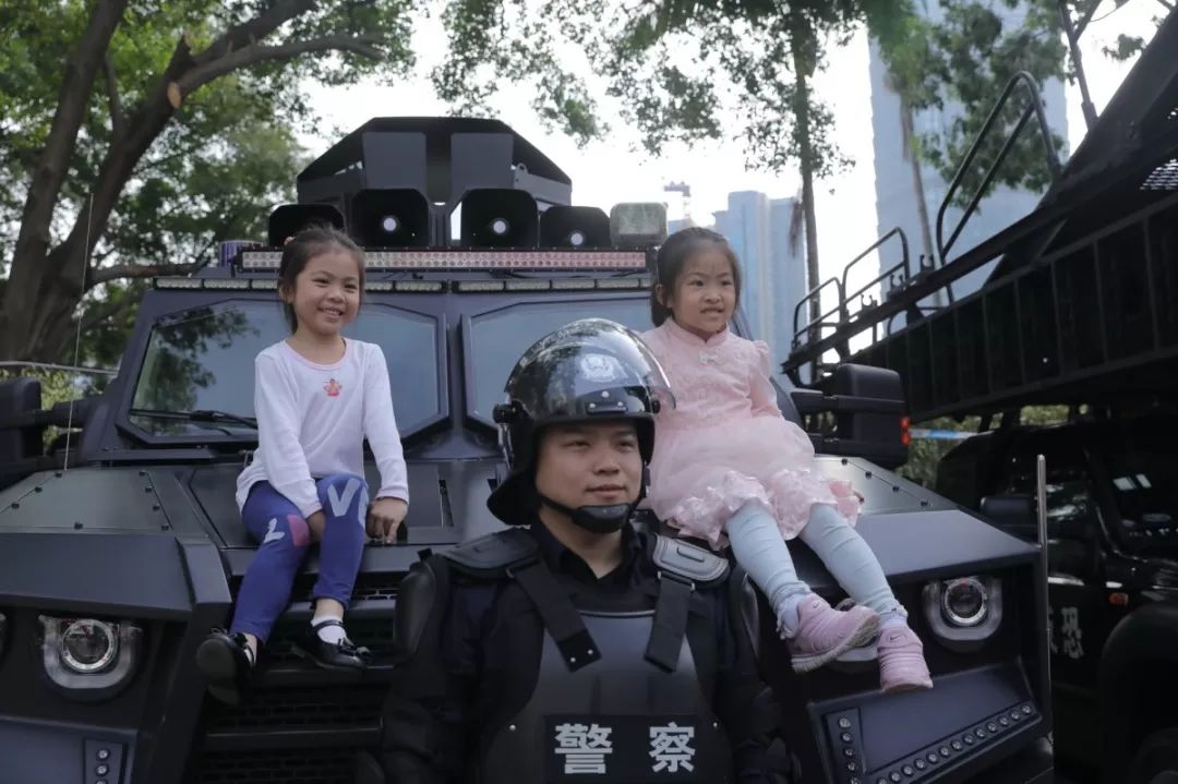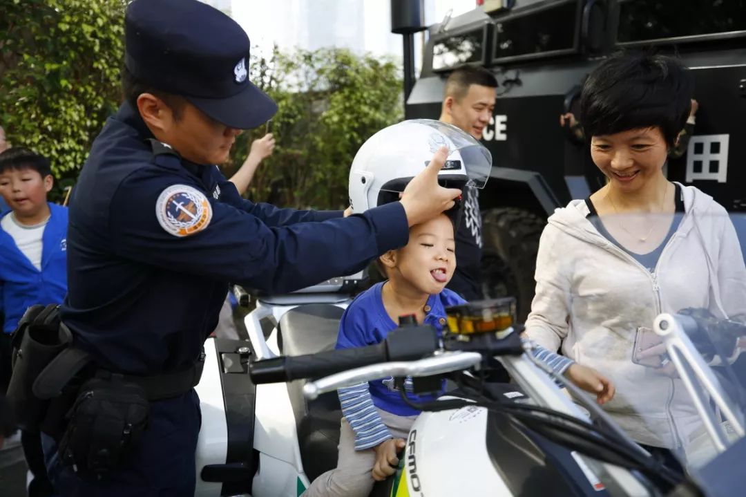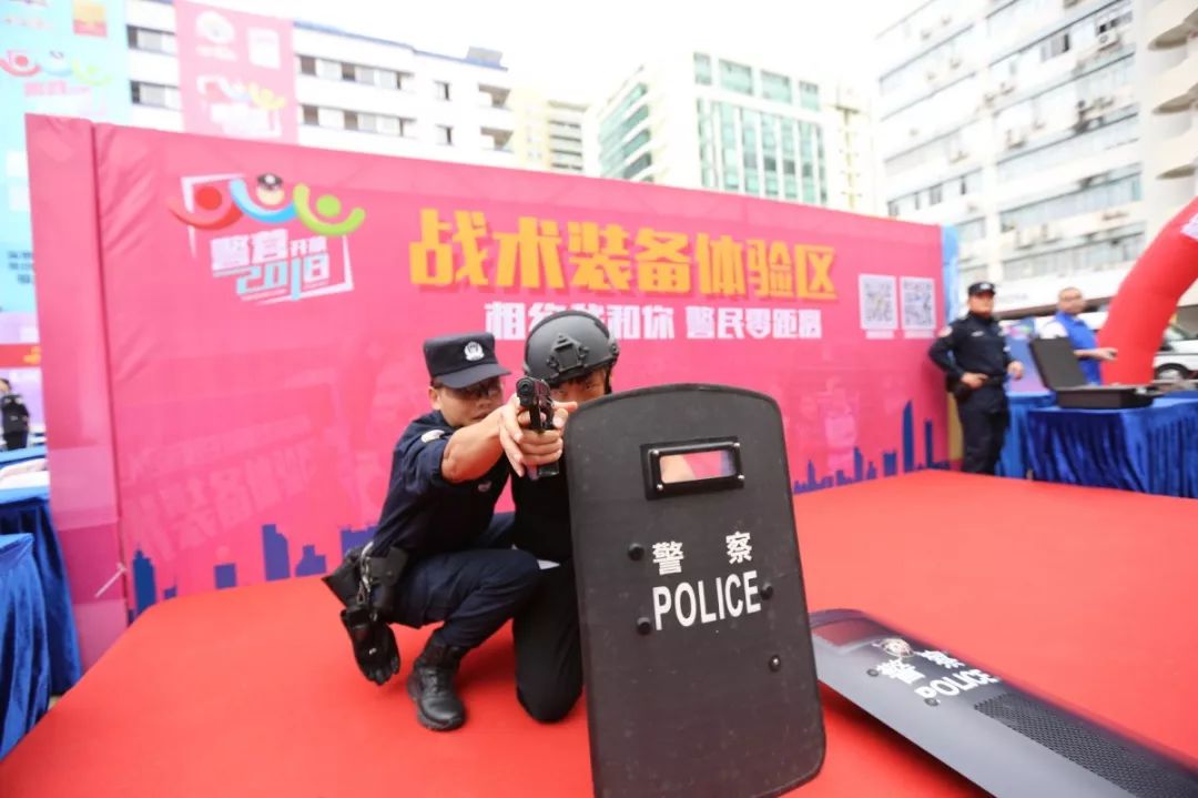 防暴盾牌、枪支警械威武霸气,队列棍术、擒拿格斗轮番上阵。很多人兴致勃勃地穿戴警用装备,头戴钢盔、身穿警服,登上反恐敞篷车拍照留念,圆梦警察梦想。