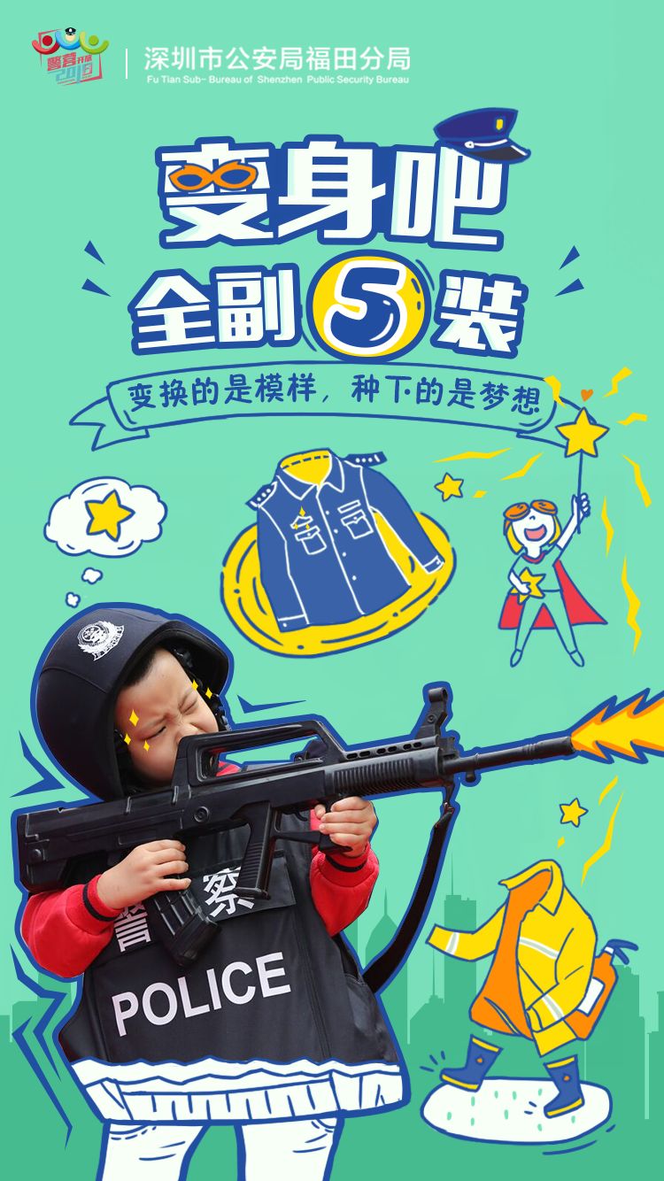福田警方从11月26日开始,连续推出开放日倒计时5期主题海报:“变身吧,全副‘5’装”、“趣玩吧,‘四’意嬉戏”、“学习吧,举一反‘3’”、“见面吧,为你‘2’来”、“一起吧,‘1’起警彩”,向市民发出邀请函,通过官方微信、微博等新媒体平台发布,抢先看精彩。