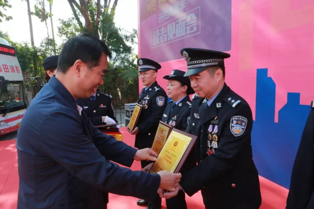 深圳市公安局与深圳特区报合办的“每日警星”专栏读者粉丝见面会在福田分局开放点火热开展,来自深圳警队刑侦、扫黑攻坚、治安、社区、特警、交警、预审等各个岗位的14名“每日警星”代表现场激情合唱中国人民警察警歌;徐文海与深圳报业集团党组副书记、副社长、总编辑周斌共同为“每日警星”代表颁发纪念牌。