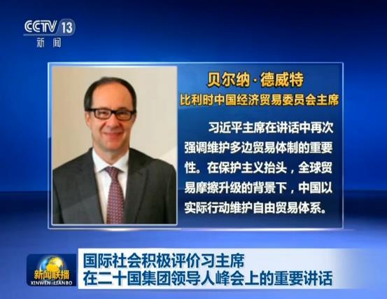 比利时中国经济贸易委员会主席贝尔纳·德威特表示,习近平主席在讲话中再次强调维护多边贸易体制的重要性。在保护主义抬头,全球贸易摩擦升级的背景下,中国以实际行动维护自由贸易体系。中国扩大开放将为世界各国企业带来巨大商机。