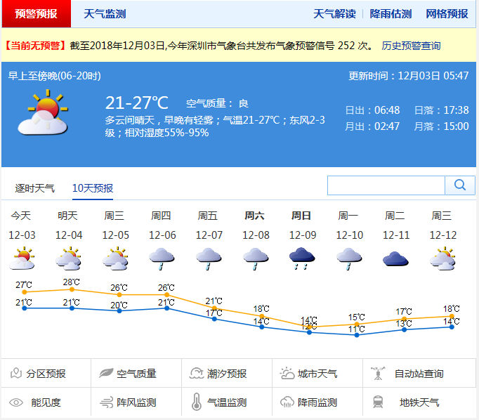 深圳新闻网12月3日讯(记者 刘婷)这个周末,深圳中午前后的温度,让人怀疑再一次回到了夏天。别担心,冷空气已经在路上了。深圳市气象台预计,本周前中期深圳天气平稳,周末天气则将转寒凉。