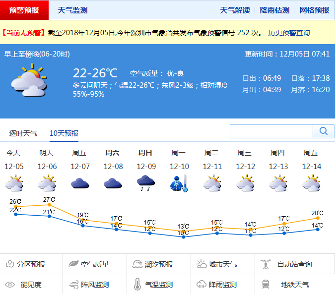 记者从深圳气象局获悉,5-6日阴天间多云,早晚有轻雾,间中有零星小雨,5日气温20-26℃;7-8日阴天有分散小雨,北风加大,气温下降,天气转凉;9-11日有中雨局部可达大雨,气温进一步下降,最低气温降至10℃左右,天气阴冷。