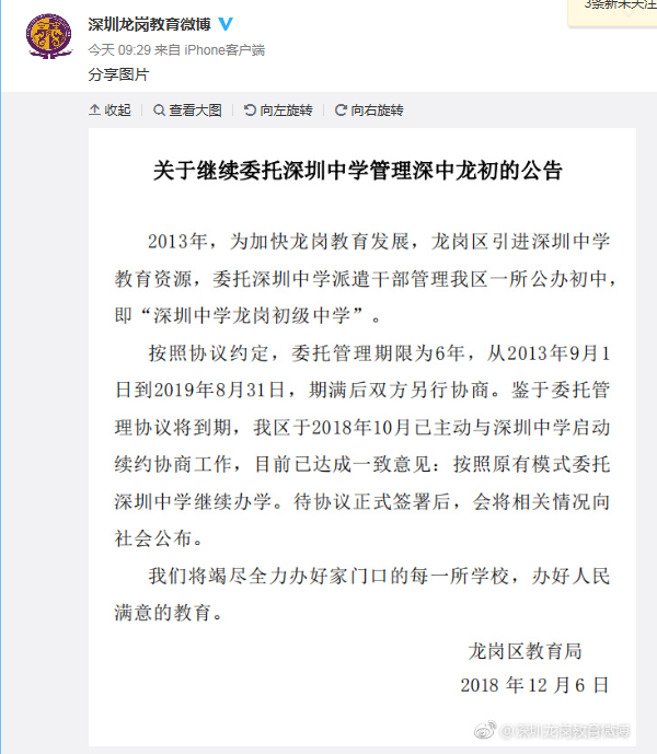 深圳新闻网12月06日讯(记者 刘婷)12月6日,深圳龙岗教育官方微博发布公告,深圳中学不走了,按照原有模式继续管理深圳中学龙岗初级中学。住在“深中龙初”附近的家长可以放心了。