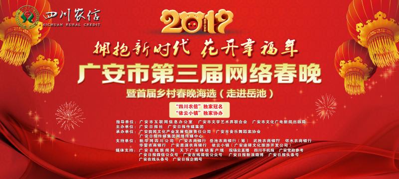 广安市第三届网络春晚暨首届乡村春晚由“四川农信”独家冠名,“依云小镇”独家协办,感谢广安农商银行、岳池农商银行(筹)、武胜农商银行、邻水农商银行、华蓥农商银行、广安思源农商银行对本届网络春晚的大力支持! (广安日报全媒体记者熊雪华)