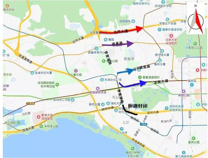 2018年12月8日至2019年6月7日,共6个月,封闭香蜜湖路滨河大道立交北转东方向匝道(香蜜湖路南行转滨河大道东行匝道)进行施工。
