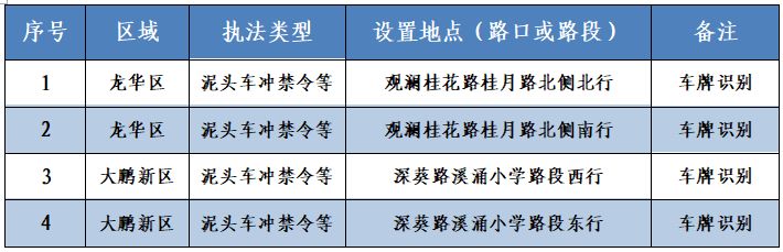 4套车牌识别监控设备可用于查处泥头车违反禁行限行规定等交通违法行为。位于龙华区的观澜桂花路桂月路和大鹏新区的深葵溪涌小学路段。