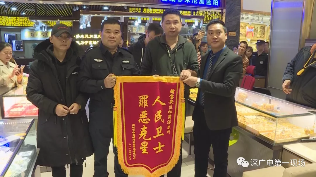 琥珀被盗后的第十天,松岗派出所民警在湖南将嫌疑人没来得及出手的琥珀全部追回。11日上午,松岗派出所民警来到松岗琥珀交易市场,把被盗的琥珀归还给事主寇先生。寇先生与琥珀交易市场给派出所民警送上锦旗表示感谢。