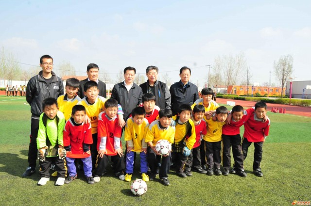 亚足联副主席张吉龙(后排右二)、省体育局局长张松林(后排右一)、市委书记、市人大常委会主任张光峰(后排右三)与定吕小学足球队合影
