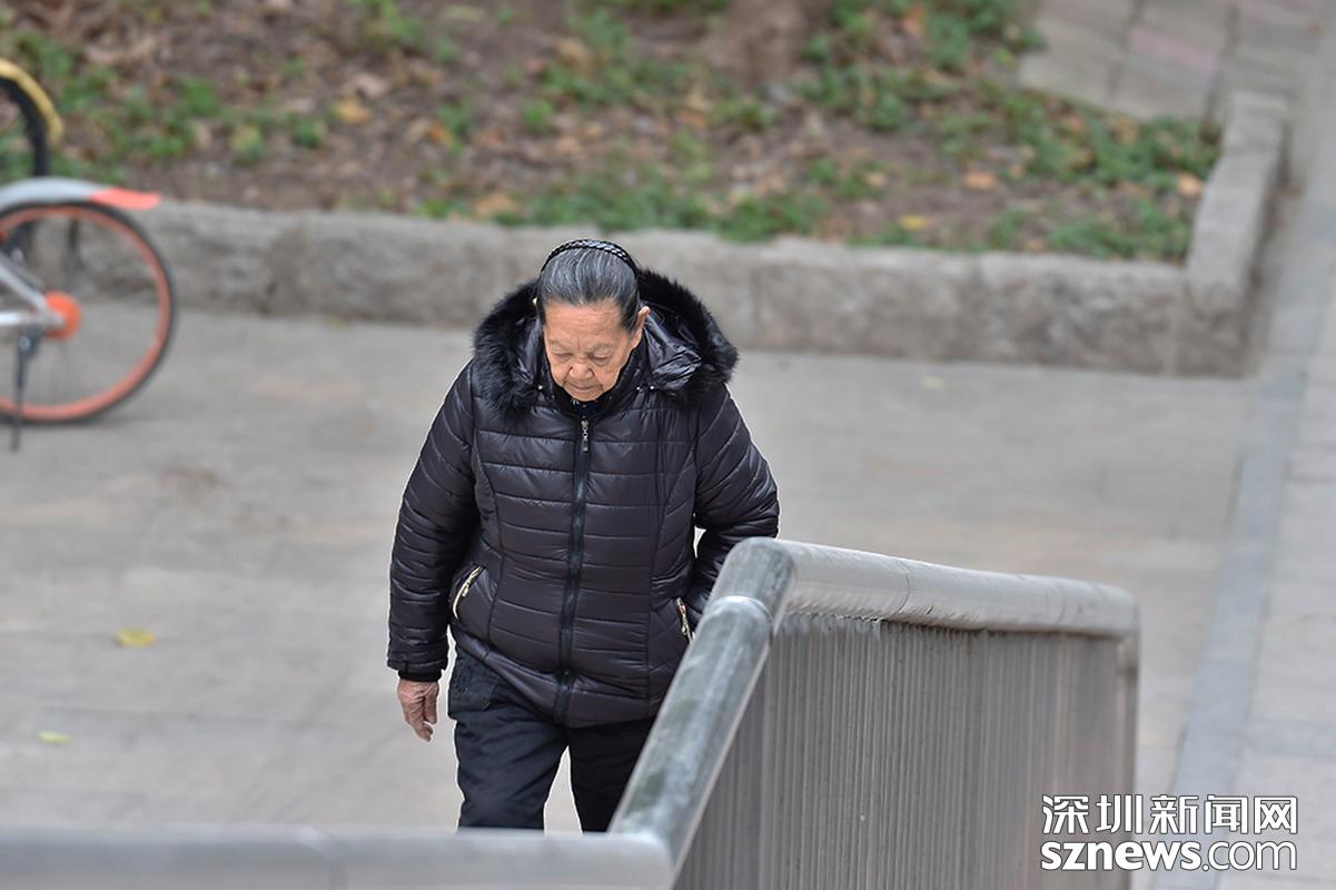 2018年12月12日,罗湖翠竹天桥,老人穿着羽绒服出行。
