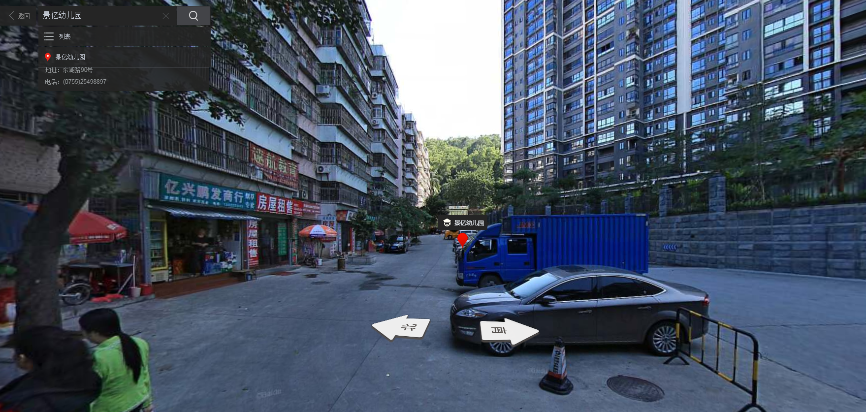 针对网帖的爆料内容,记者查询了百度全景地图,以景亿幼儿园作为第一视角,正对其大门的道路如该网友所言,一半以上被用来停车,而另一半则用来给行人和车辆共同通行。