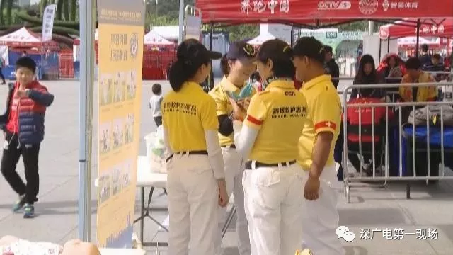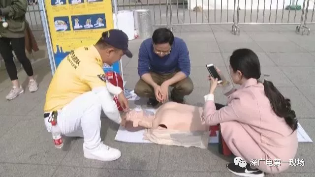 在市民中心广场的另一侧,还有赛场医疗救援志愿者,在地面上摆出模型,为参赛选手普及心肺复苏等方面的急救知识。在明天赛事进行期间,多组救援团队也将在现场为参赛者提供紧急救援。