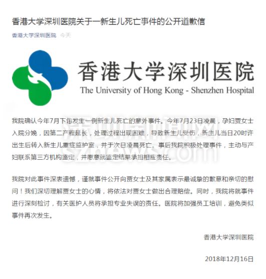 ⑤12月16日,针对一起发生在2018年7月的新生儿死亡事件,香港大学深圳医院在该院官方微信上发布“公开道歉信”。香港大学深圳医院表示,事后其积极处理事件,主动与产妇联系第三方机构鉴定,并愿意就鉴定结果承担相应责任。