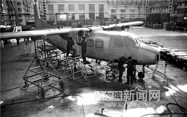 哈尔滨飞机制造公司自行研制的运12多用途民用飞机取得了国内首份按国际规范研制的民用飞机“型号合格证”,图为当年的制造车间。